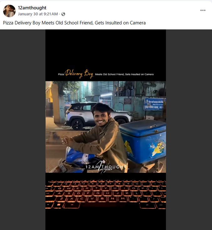 कई न्यूज़ आउटलेट्स और सोशल मीडिया यूज़र्स एक वीडियो शेयर कर रहे हैं, जिसमें दावा किया जा रहा है कि एक महिला अपने पुराने स्कूलमेट का मज़ाक उड़ा रही है क्योंकि वह पिज़्ज़ा डिलीवरी एग्जीक्यूटिव के तौर पर काम करता है. 31 सेकंड के इस वीडियो में एक महिला एक आदमी को उसके स्कूटर पर फ़िल्माते हुए दिख रही है, और हिंदी में कह रही है, “यह मेरा दोस्त है जो मुझे पढ़ाई के लिए मोटिवेशनल रील्स भेजता था. आज वह 30 साल का है और डोमिनोज़ पिज़्ज़ा में काम करता है.” चलिए इस दावे की पुष्टि करते हैं.