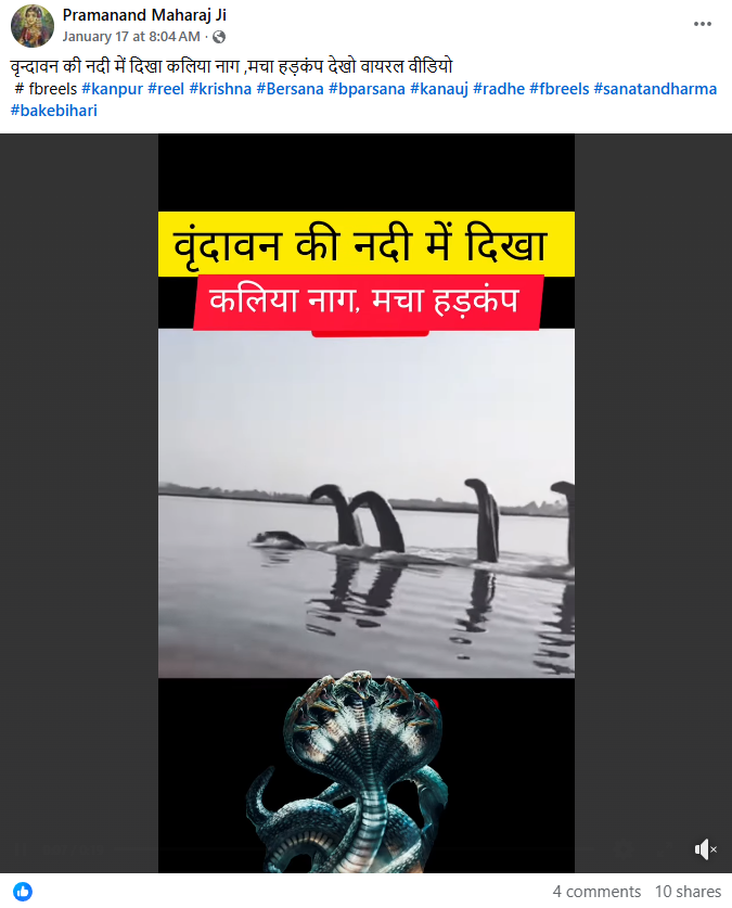 Facebook पर यूजर ने वीडियो पोस्ट करते हुए लिखा, “वृंदावन की नदी में दिखा कालिया नाग, मचा हड़कंप” यूजर ने यह वीडियो जनवरी 17, 2026 को पोस्ट किया है.