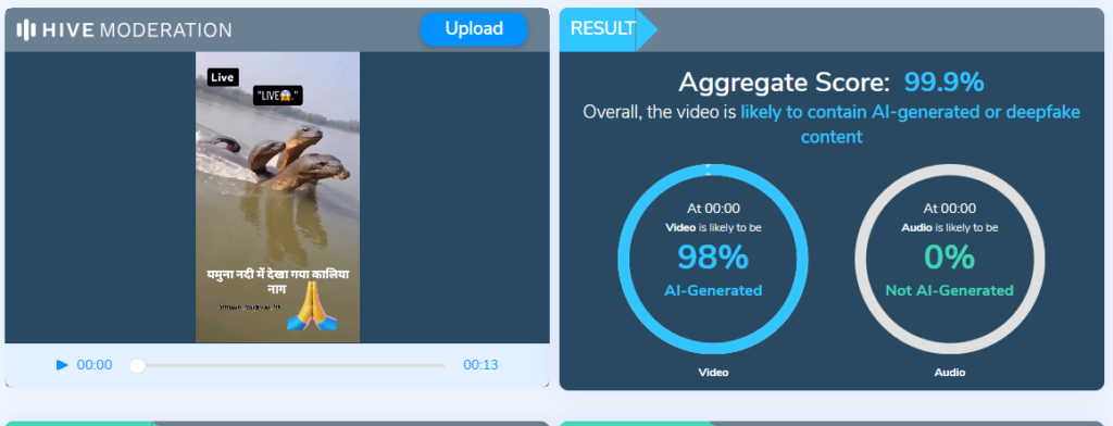 कालिया नाग के दावे से वायरल हुए वीडियो को हमने AI डिटेक्शन टूल पर चेक किया. जहां इस टूल ने वीडियो के 99.9 प्रतिशत AI जेनरेटेड होने की सम्भावना जताई.