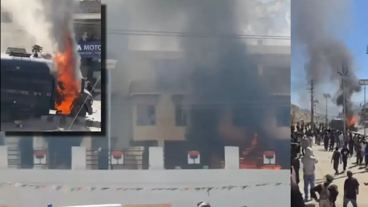 लेह में हिंसक प्रदर्शन: बीजेपी कार्यालय के बाहर प्रदर्शनकारियों ने लगाई आग