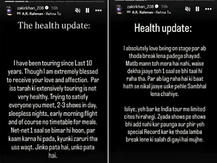 ज़ाकिर ने बताया कि पिछले दस साल से वह लगातार देशभर में शो कर रहे हैं। उन्होंने लिखा, “मैं पिछले दस साल से टूर कर रहा हूं। मुझे आप सभी से जो प्यार और सपोर्ट मिला, उसके लिए मैं शुक्रगुज़ार हूं। लेकिन इतनी ज्यादा टूरिंग सेहत के लिए सही नहीं है। मैं पिछले एक साल से बीमार हूं, लेकिन काम करता रहा क्योंकि उस समय ये ज़रूरी लगा।”