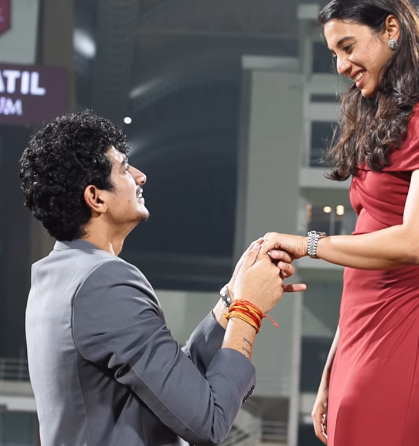 भारत की स्टार क्रिकेटर स्मृति मंधाना को उस समय एक खूबसूरत सरप्राइज़ मिला, जब उनके मंगेतर और पलाश मुच्छल ने उन्हें मुंबई के डीवाई पाटिल स्टेडियम में प्रपोज़ किया। यहीं कुछ दिन पहले भारत ने दक्षिण अफ्रीका को हराकर महिला वनडे वर्ल्ड कप का खिताब जीता था। पलाश ने सोशल मीडिया पर जो वीडियो शेयर किया, उसमें वह स्मृति को आंखों पर पट्टी बांधकर मैदान के बीच ले जाते नजर आते हैं। जैसे ही स्मृति पट्टी हटाती हैं, पलाश घुटनों पर बैठकर उन्हें रिंग दिखाते हुए शादी का प्रस्ताव रखते हैं।