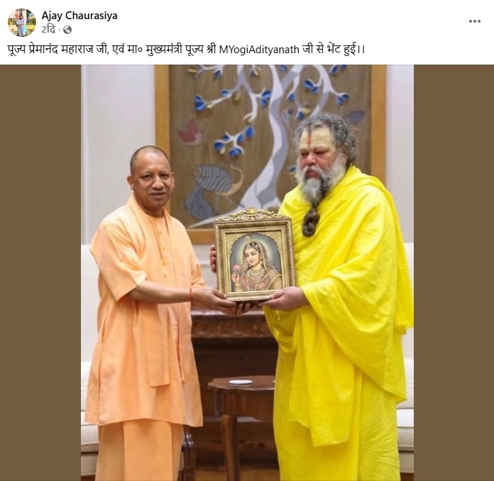 NM Verified: सोशल मीडिया पर हाल ही में एक तस्वीर तेजी से वायरल हुई, जिसमें उत्तर प्रदेश के मुख्यमंत्री Yogi Adityanath और गुरु प्रेमानंद गोविंद शरण महाराज को एक साथ एक तस्वीर पकड़े हुए दिखाया गया था। इस पोस्ट के साथ यह दावा किया जा रहा था कि दोनों के बीच एक आधिकारिक मुलाकात हुई है।