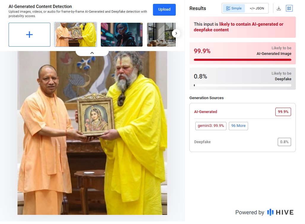 इसके बाद तस्वीर की तकनीकी जांच AI डिटेक्शन टूल Hive Moderation के जरिए की गई। रिपोर्ट में स्पष्ट संकेत मिले कि यह तस्वीर वास्तविक नहीं है, बल्कि आर्टिफिशियल इंटेलिजेंस की मदद से बनाई गई है।